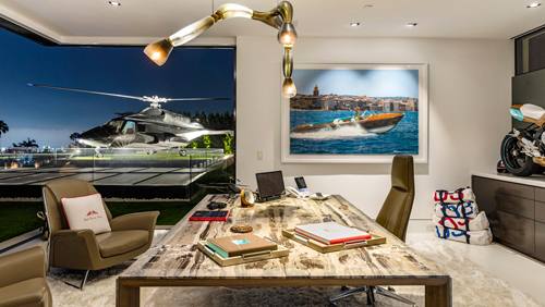 Biệt thự có tổng diện tích 3.500 m2, gồm 12 phòng ngủ, 25 phòng tắm. Cầu thang thép