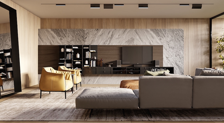 Không gian phòng khách được trang trí bằng nhiều chất liệu tự nhiên như gỗ, đá cẩm thạch