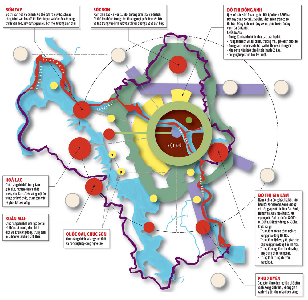 Ngoài 5 đô thị vệ tinh, các thị trấn được kết nối bằng hệ thống giao thông đường vành đai kết hợp các trục hướng tâm, liên kết với mạng lưới giao thông vùng và quốc gia. Dự báo dân số Hà Nội đạt khoảng 7,3-7,9 triệu người vào năm 2020 và năm 2030, đạt khoảng 9 triệu người.
