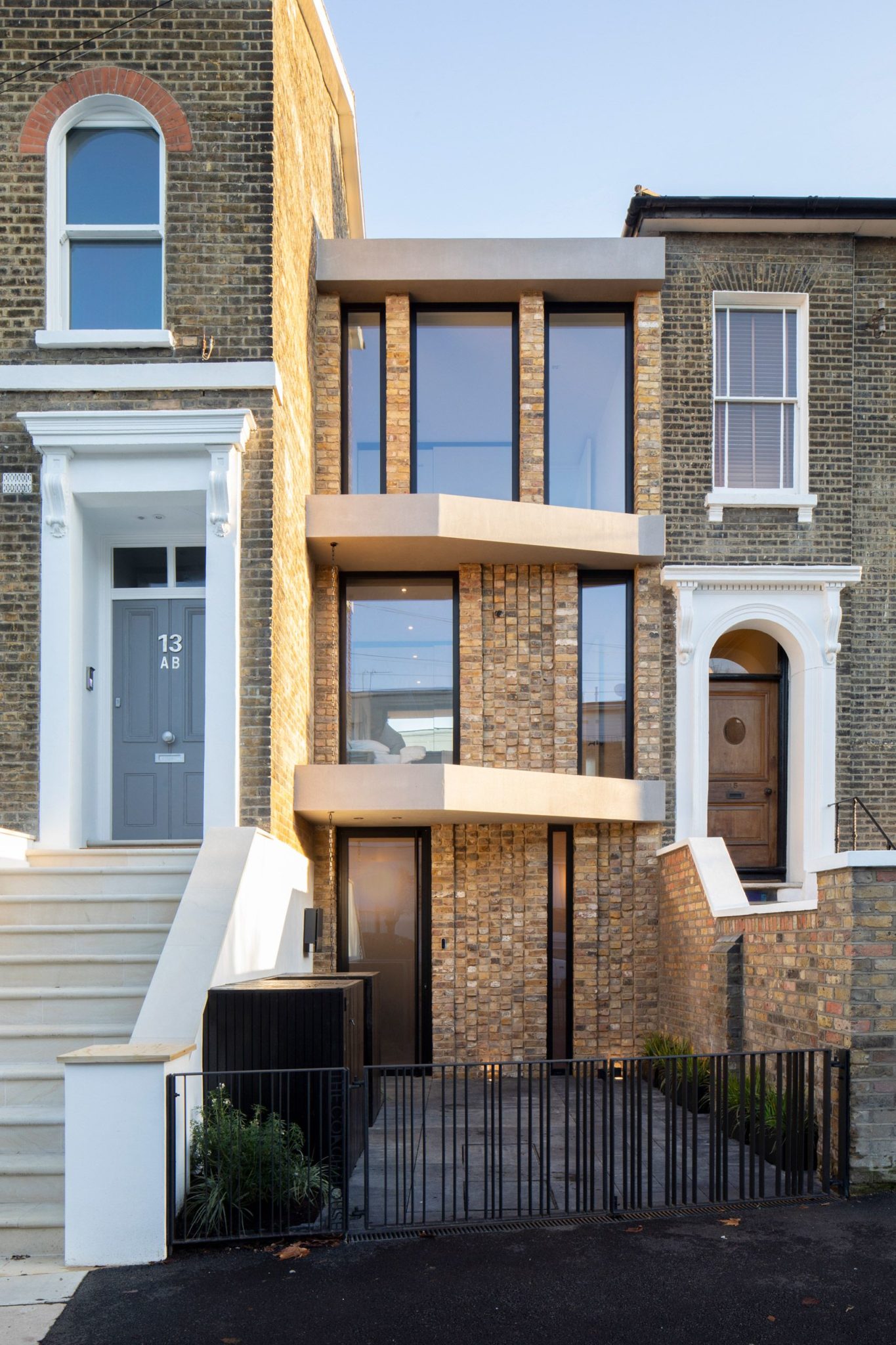 | Nằm trên lô đất hẹp, xen kẹt giữa hai tòa nhà cao tầng ở London, ngôi nhà phố vay mượn khá nhiều chi tiết kiến trúc từ các công trình lân cận. |