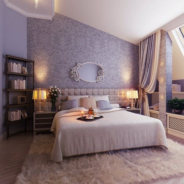Tường phòng ngủ màu tím oải hương điệu đà. Gam màu này là một cặp