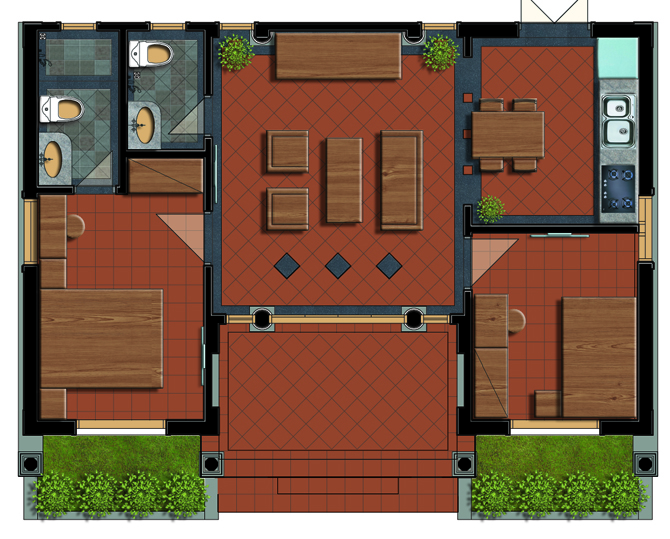 Mẫu nhà này nên sử dụng đồ nội thất như: sập gụ, tủ chè, hoành phi câu đối…