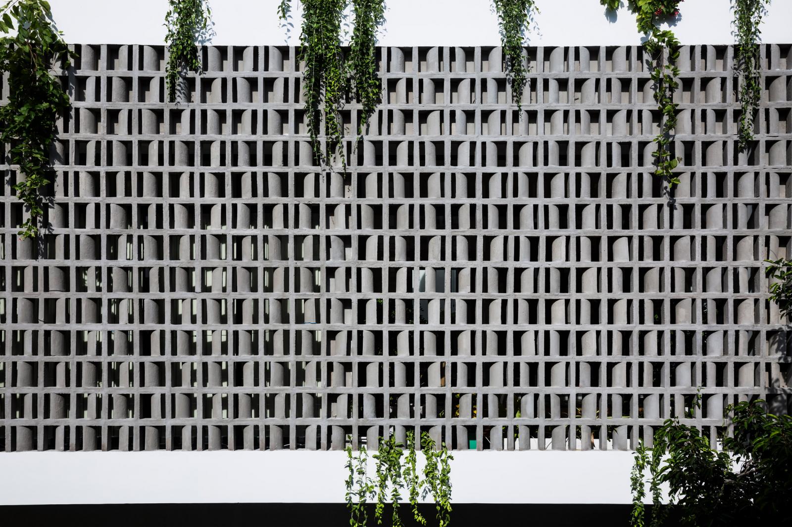 | Tường gạch thông gió giúp cản bớt ánh nắng gay gắt chiếu vào mặt tiền phía Tây mà vẫn cho phép thông gió tự nhiên diễn ra. |