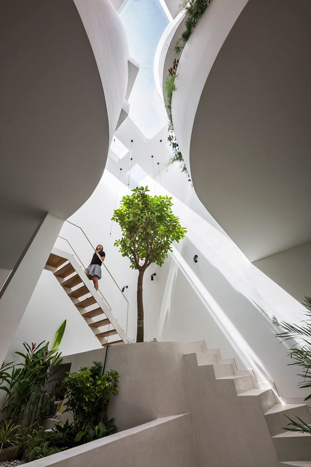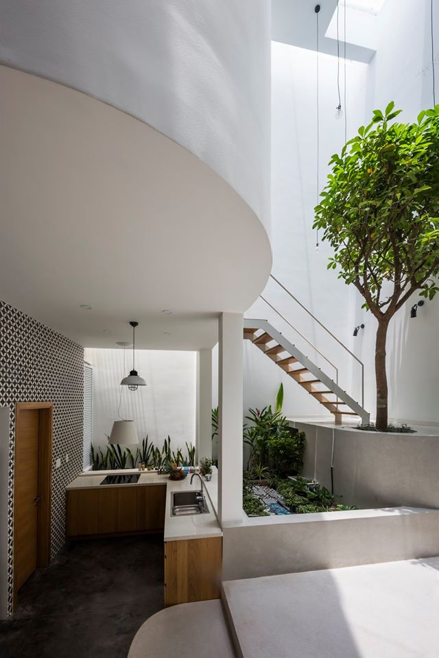 | Ở đây, các đường cong cũng có tác dụng xóa mờ ranh giới giữa khu vực giếng trời với các không gian riêng tư còn lại. |