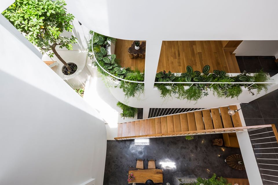 Với một không gian thông thoáng như vậy, sự phân bổ ánh sáng, cây xanh xen lẫn vào hình khối không gian trong nhà là chìa khóa để tránh cảm giác quá loãng của không gian. Ở đây, cây xanh và ánh sáng sẽ là vật liệu hoàn thiện lý tưởng để người thiết kế khỏa lấp cac khoảng tường trắng lộ ra khi các vách ngăn xuất hiện dọc theo không gian giếng trời trong nhà.