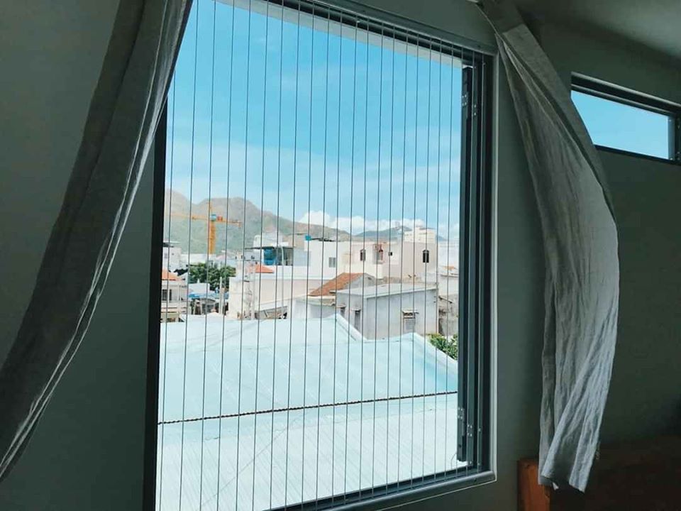 Cửa sổ được bảo vệ bằng lưới thép mảnh, an toàn mà không cản trở tầm nhìn.