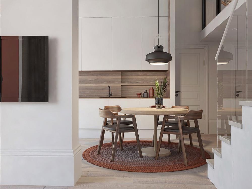 Mẫu phòng ăn này được tạo thêm chiều sâu bằng tấm thảm len tròn gam màu ấm áp.