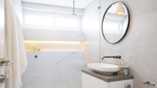 Nội thất màu trắng hoặc màu be là lựa chọn thú vị cho phòng tắm tối giản