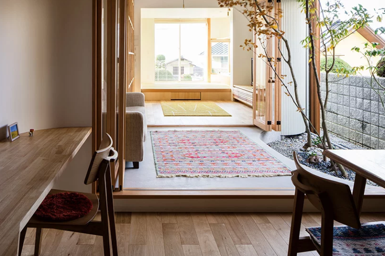 Đáp lại mong muốn về một tổ ấm kết nối mật thiết với môi trường tự nhiên, Satoshi Saito đã thiết kế ngôi nhà bao quanh khoảng vườn nhỏ. Với cây xanh và băng ghế, khoảng giếng trời đa năng này được gọi là vườn khô, đóng vai trò như một phòng chức năng trong nhà.
