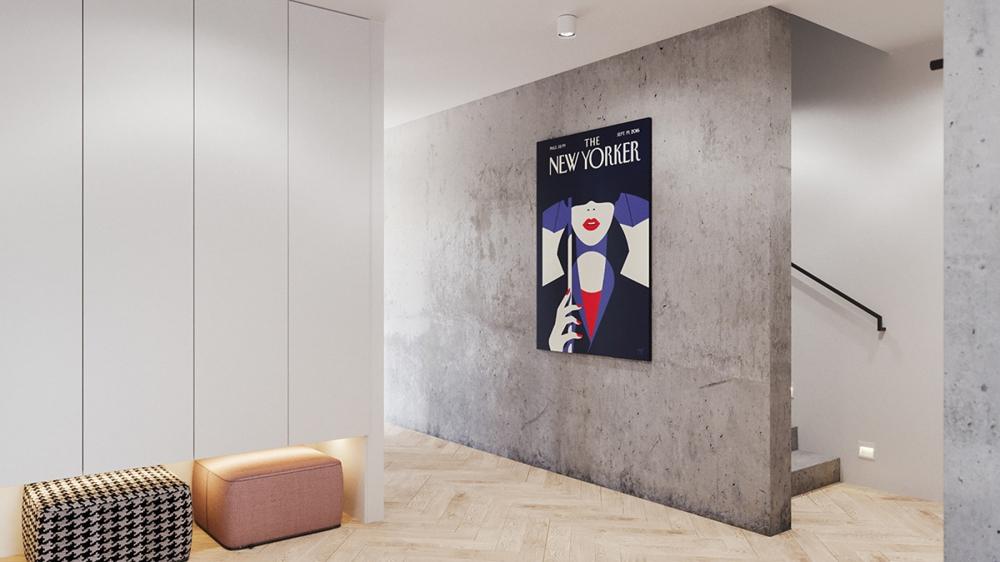 Một bức tường bê tông màu xám ở hành lang được tạo điểm nhấn bằng bức tranh thú vị.