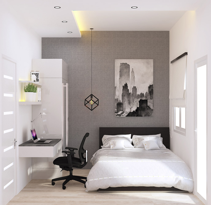 Phòng ngủ của hai con trai giản dị với tông màu trắng đen. Bàn học gắn vào tường giúp tiết kiệm diện tích