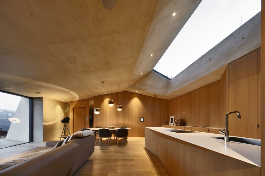 | Dù một phần công trình nằm chìm vào lòng đồi, hệ thống đèn cùng giếng trời vẫn đảm bảo đủ ánh sáng cho căn phòng. Những thiết kế đèn thông minh cũng giúp mở rộng không gian, mang lại nét hiện đại và thanh lịch. Ảnh: Pavol Mikolajcak Architekten |